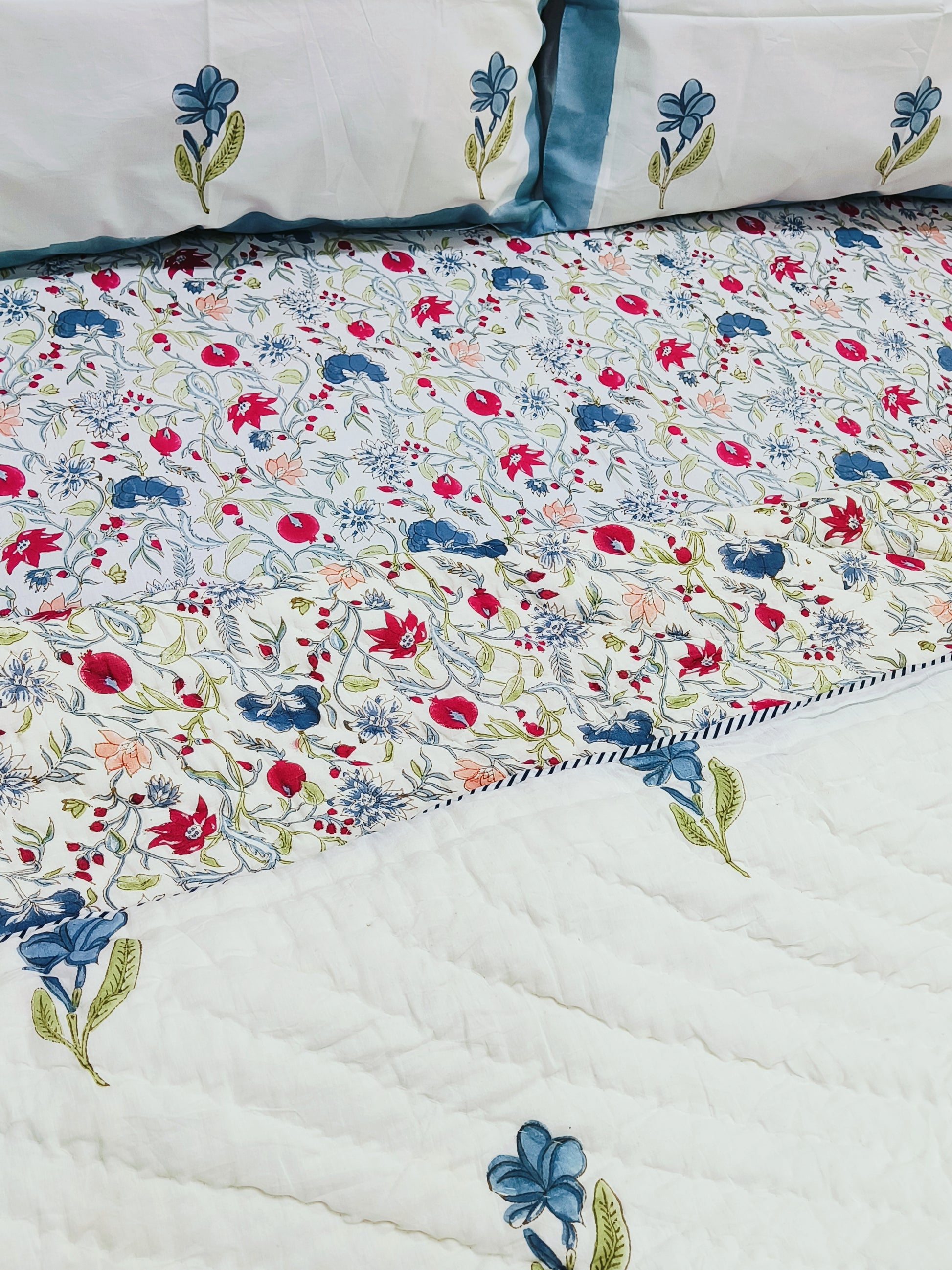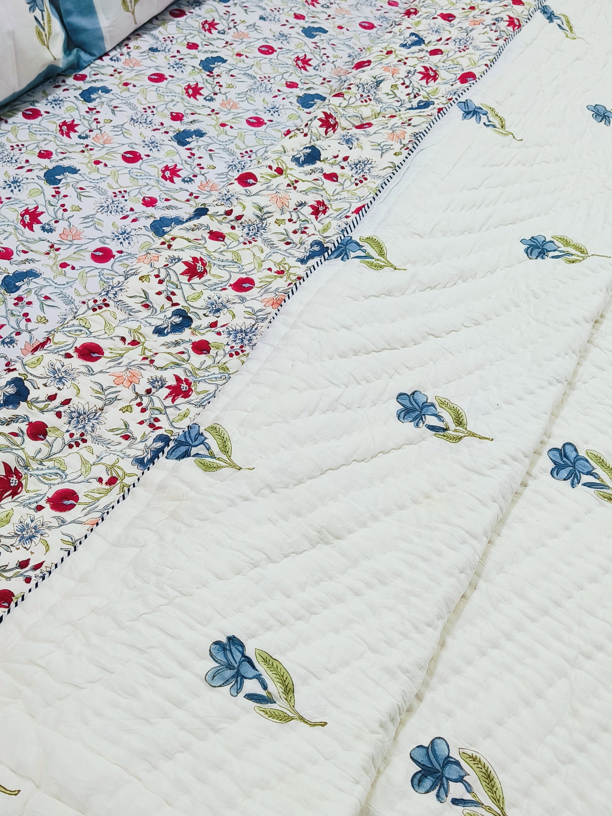 A Quilt is a thin Cover filled with Cotton gives you warmth in AC and in Winters. They are used to take over During Sleep
